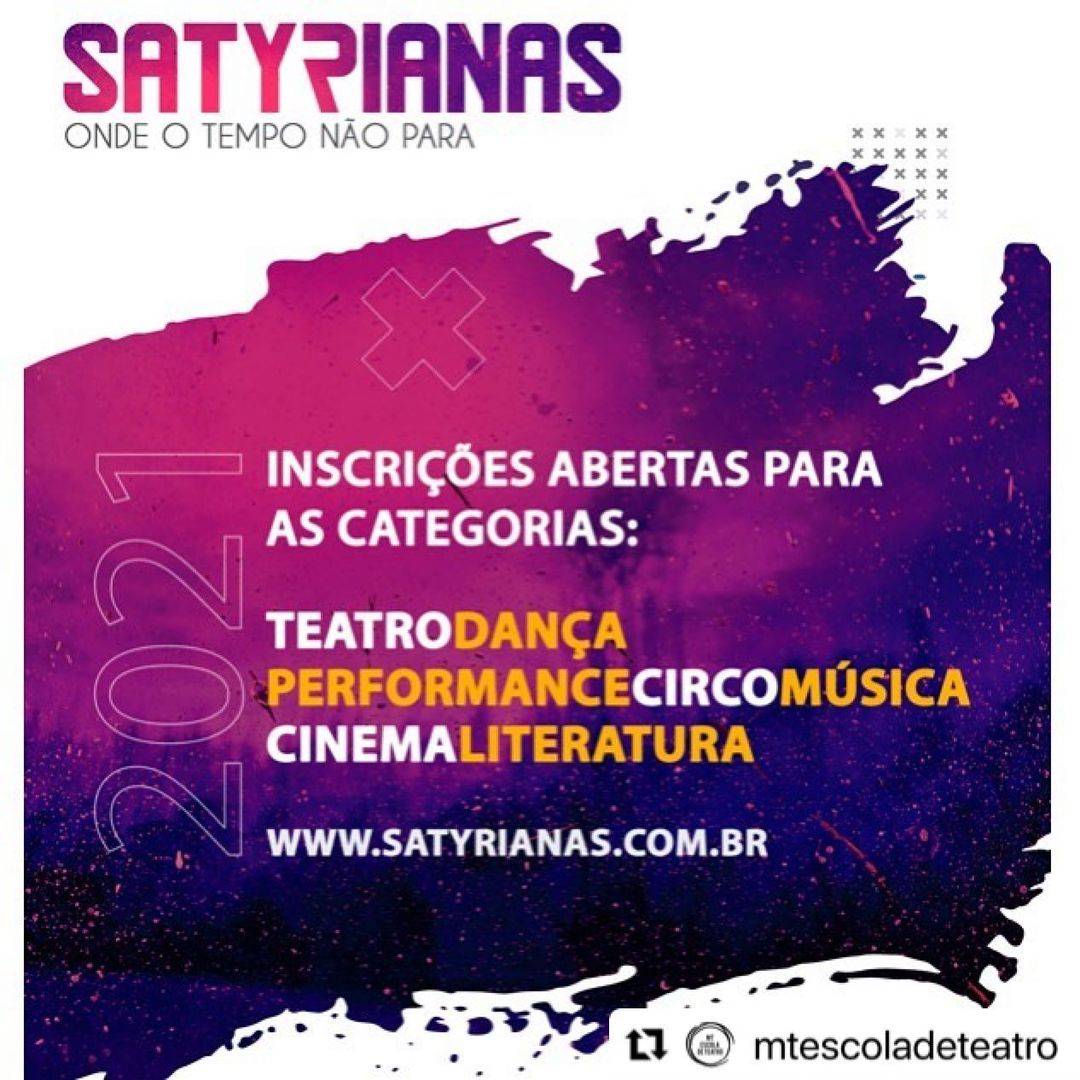 Festival Satyrianas – Inscrições até o dia 05 de novembro pelo site: https://www.satyrianas.com.br/. Poderão se inscrever grupos ou artistas individuais (amadores, estudantis ou profissionais) que atuem nas áreas de teatro, dança, circo, performance, música, artes visuais, cinema e afins.