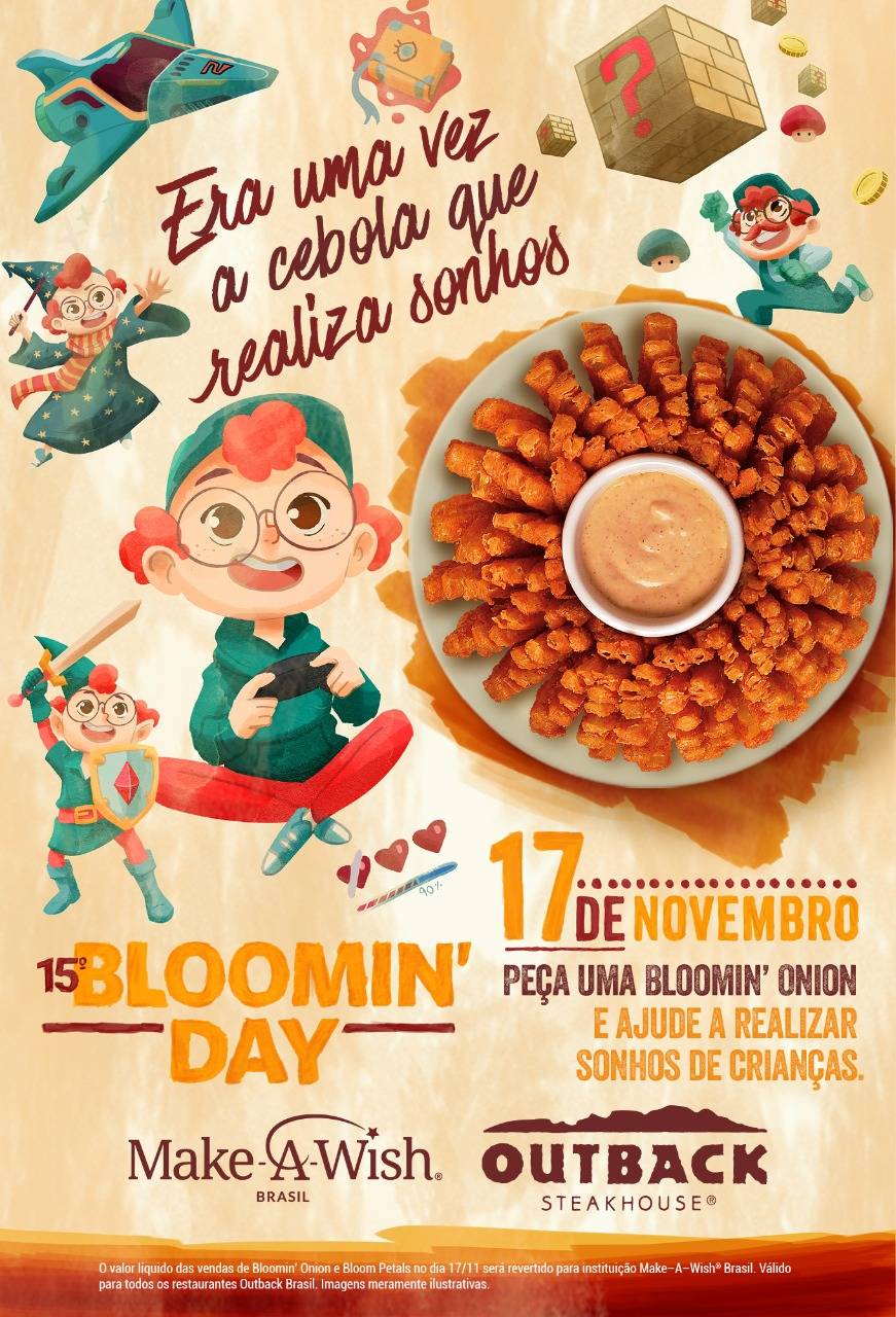 Era uma vez a cebola que realiza sonhos. No dia 17 de novembro, o Outback Steakhouse realizará o seu 15º Bloomin’ Day, campanha que reverte todo o valor líquido da venda da cebola gigante Bloomin’ Onion nos restaurantes ou das Bloom Petals no delivery para uma instituição beneficente. Este ano, assim como nas últimas três campanhas, a renda será destinada à Make-A-Wish® Brasil, entidade que proporciona a realização de sonhos de crianças com doenças graves. E a ação já vem rendendo bons frutos: 118 sonhos já foram realizados com as doações dos anos anteriores, segundo a própria entidade. E a meta é superar a marca de 180 ainda esse ano.