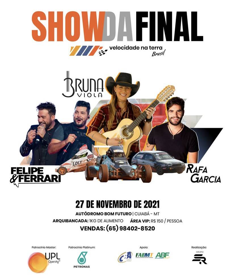Três atrações vão abrilhantar a decisão do título nacional da temporada 2021 do Velocidade na Terra. Bruna Viola, Rafa Garcia e Felipe & Ferrari serão os responsáveis por animar ainda mais a festa do título no encerramento do campeonato no sábado (27), no Autódromo Bom Futuro.