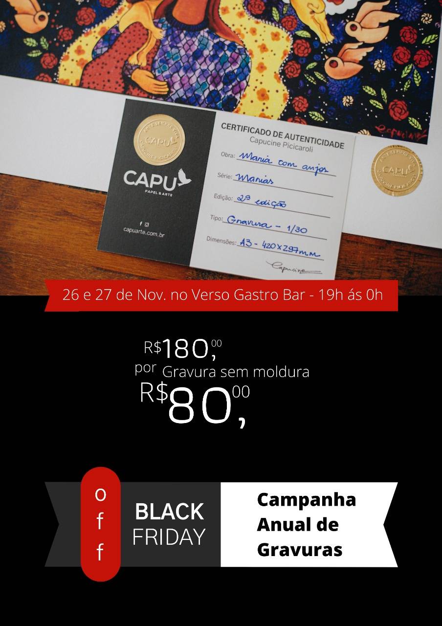 Os pedidos de gravuras podem ser antecipados com a Capu Papel & Arte, organizadora do evento, pelo WhatsApp (65) 99612-8491 e Instagram @capupapelearte, com o portfólio no link da bio (https://bit.ly/gravurascapu), ou visitando presencialmente o evento no Verso, com a possibilidade de escolher as imagens favoritas.