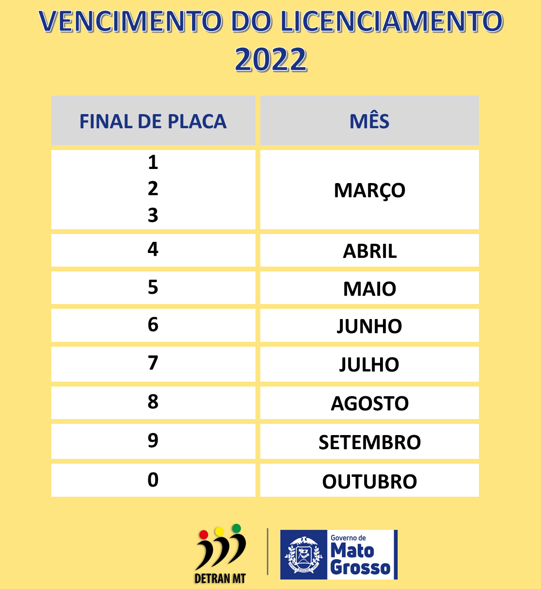 Para veículos com placas finais 1, 2 e 3 o vencimento do Licenciamento será em março. Placa final 4, será em abril; final 5 em maio; final 6 em junho; placa final 7 será em julho; final 8 em agosto; 9 em setembro e placa final 0 em outubro.