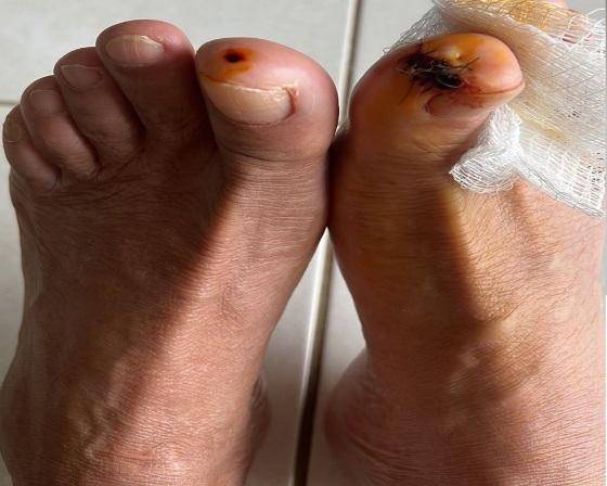 Ele acabou atacado por piranhas- e teve dois dedos do pé atingidos e levou oito pontos.