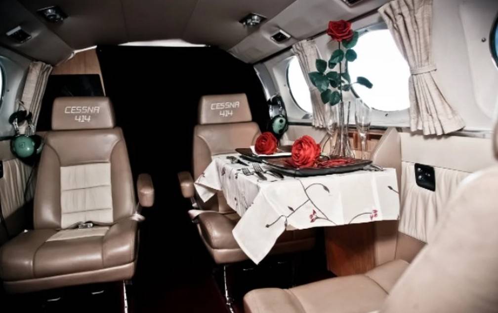 No interior da aeronave, um bimotor Cessna 414, há um ambiente equipado com sistemas de luz LED, som a gosto do freguês, lençóis de cetim vermelho e até travesseiros e colchão personalizados. Para garantir a privacidade dos passageiros, os pilotos usam fones de ouvido com cancelamento de ruído.