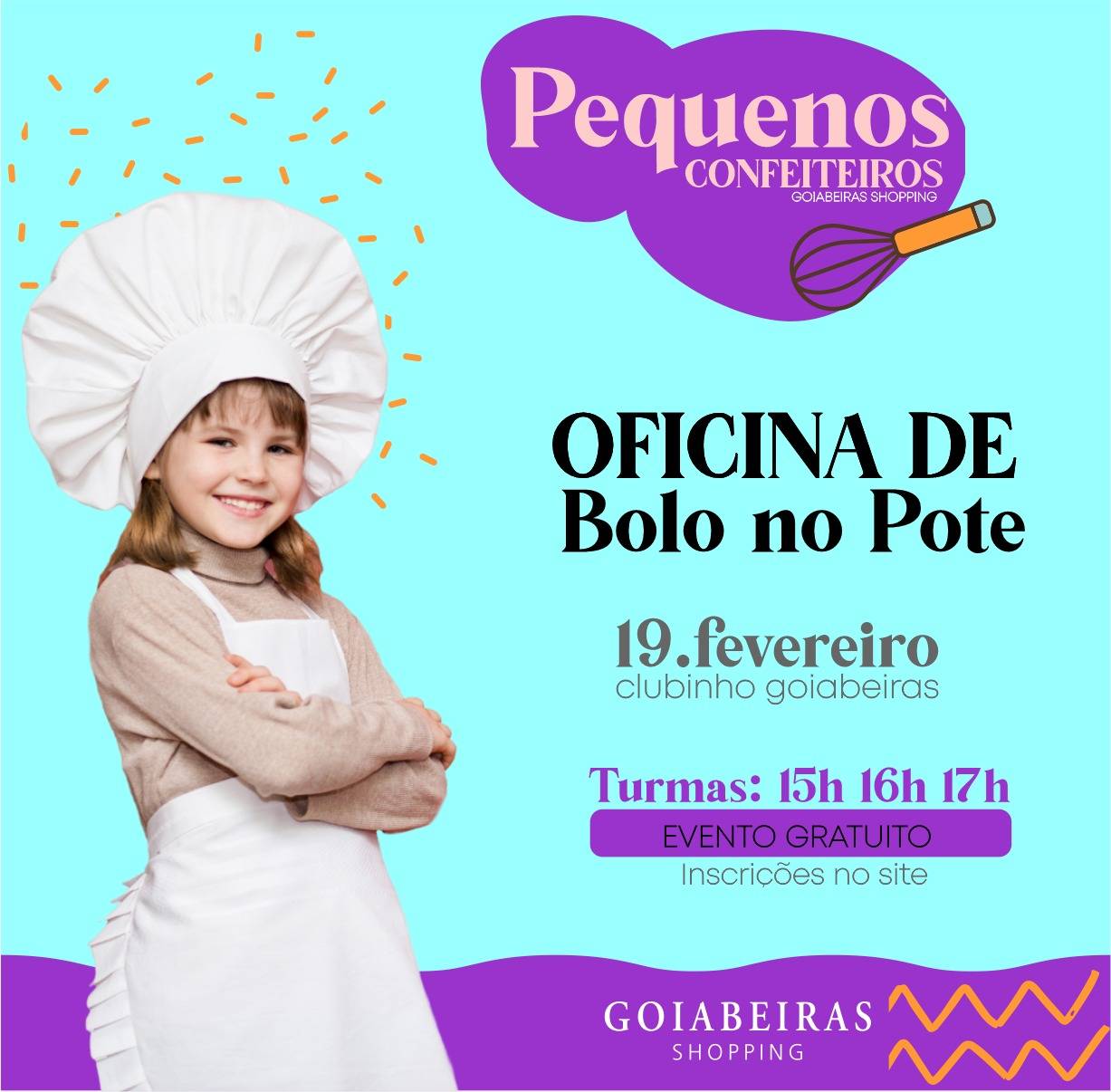 O evento é gratuito e será realizado no espaço Clubinho Goiabeiras, no 1° piso, com três turmas divididas nos seguintes horários: 15h, 16h e 17h. A faixa etária para participação é livre. As inscrições podem ser feitas através do link: https://www.sympla.com.br/evento/oficina-de-bolo-no-pote/1490214