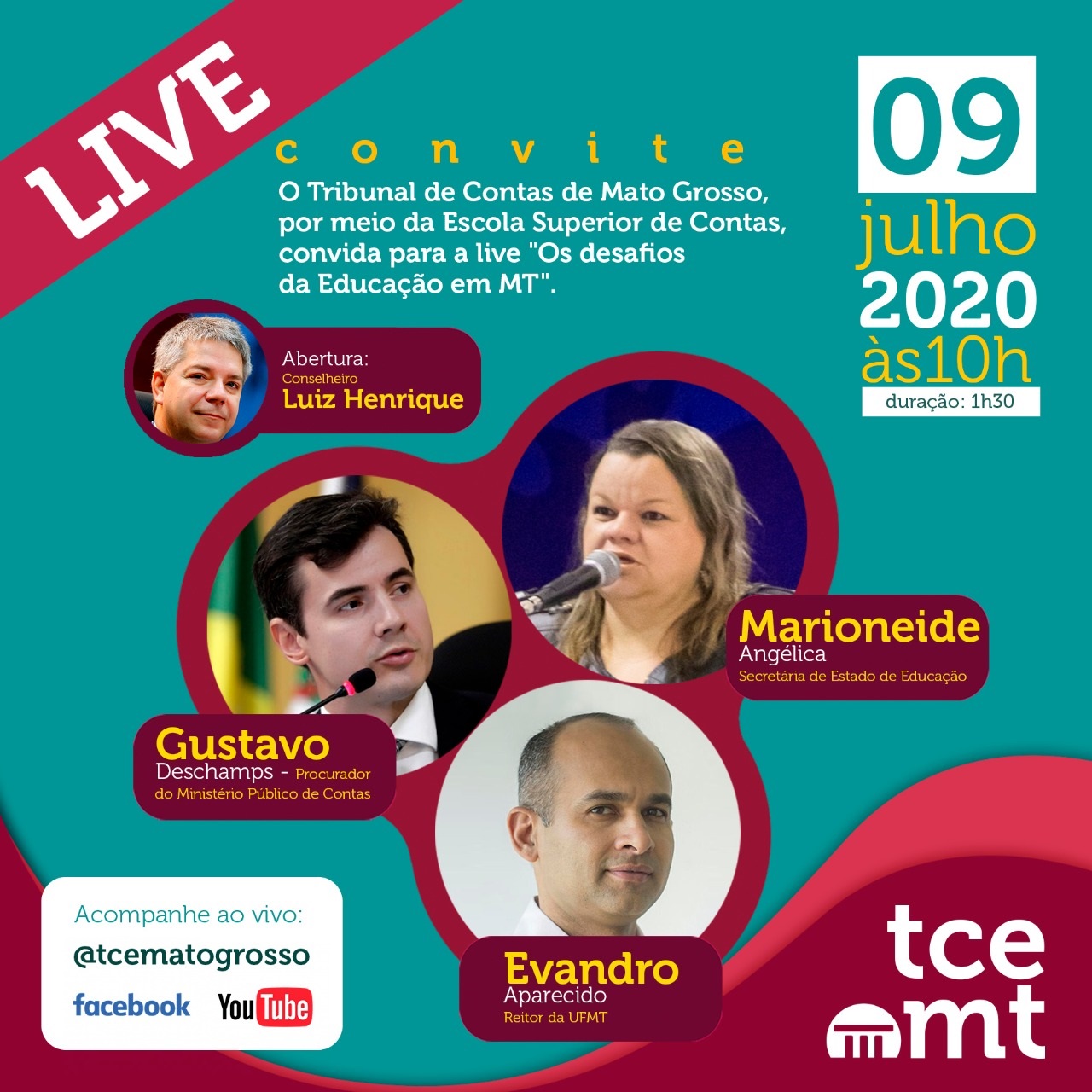 A Escola Superior de Contas do Tribunal de Contas de Mato Grosso (TCE-MT) promove, às 10h desta quinta-feira (9), a live “Os desafios da Educação em MT”, com a participação da secretária estadual de Educação, Marioneide Kliemaschewsk, do reitor da Universidade Federal de Mato Grosso (UFMT), Evandro Soares, e do procurador do Ministério Público de Contas (MPC) Gustavo Coelho Deschamps.
