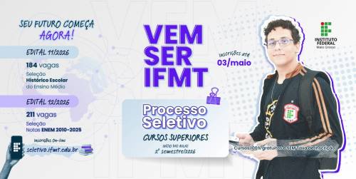 O Instituto Federal de Mato Grosso informa que estão abertas nesta segunda-feira, dia 30 de março, as inscrições para o Processo...