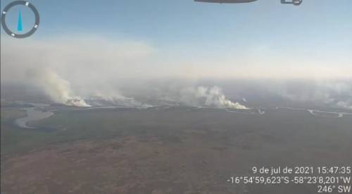 O Corpo de Bombeiros Militar de Mato Grosso (CBM-MT) monitora um incêncio florestal no Distrito de Angel Sandoval, em Santa Cruz, na Bolívia,...