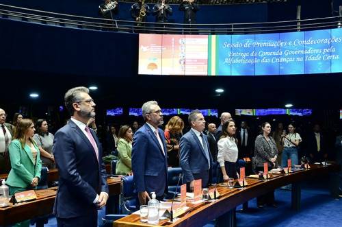 O governador Mauro Mendes foi homenageado nesta segunda-feira (13), em sessão solene no Senado Federal, com a comenda "Governadores pela Alfabetização...