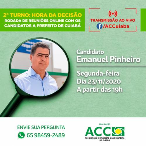 A Associação Comercial e Empresarial de Cuiabá (ACC) realiza um encontro on-line com os candidatos à Prefeitura da capital...