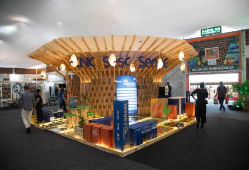 Com conceito socioambiental, o espaço tem como cenário as belezas dos biomas brasileiros Madeira e papelão compõem o estande...